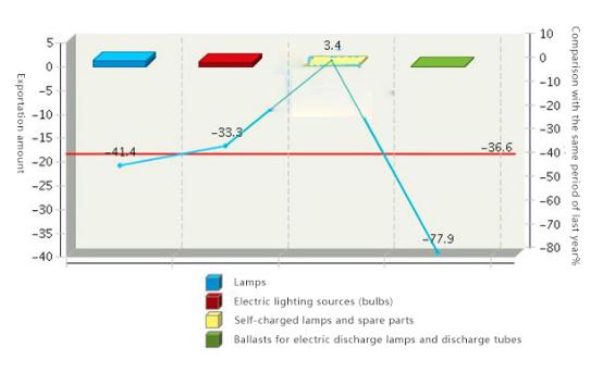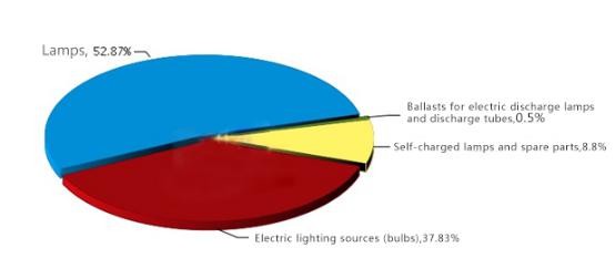 From January to June in 2016, the total exportation amount of companies in China reached 236 billion dollars with an increase of -36.58% comparing to the same period of last year. The exportation of lamps reached 125 million dollars (occupying 52.87% of the total amount) with an increase of -41.36% comparing to the same period of last year. The exportation of lighting sources (bulbs) reached 89 million dollars (occupying 37.83% of the total amount) with an increase of -33.33%. The exportation of self-charging lamps and spare parts reached 21 million dollars (occupying 8.8% of the total amount) with an increase of 3.43%. The exportation of ballasts for electric discharge lamps and discharge tubes reached 1 million dollars (occupying 0.5% of the total amount) with an increase of -77.9%.